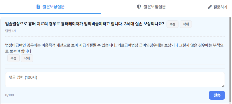 ※ 배너의 보상/보험 버튼을 클릭하시면 다크화면에 100자보험질문에 대한 전체보기 서비스로 연결됩니다.