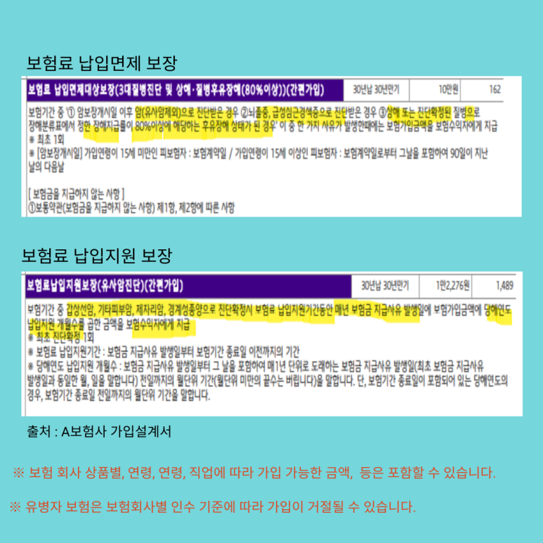 ※보험회사 상품별, 성별, 연령, 직업에 따라 가입 가능한 담보와 가입 금액, 보험료 등은 달라질 수 있습니다.