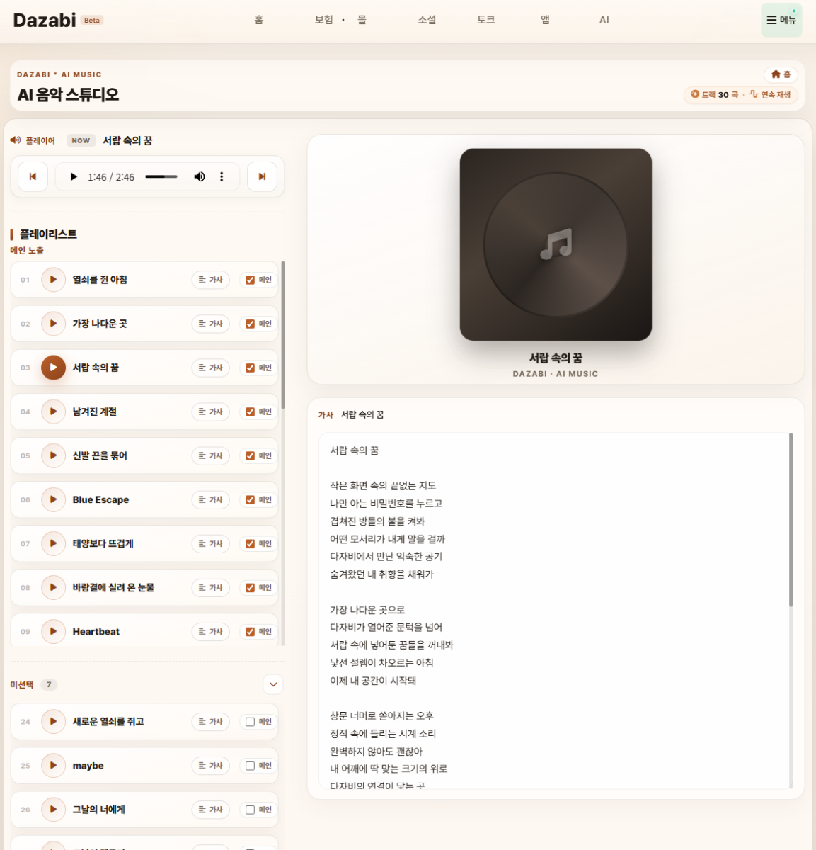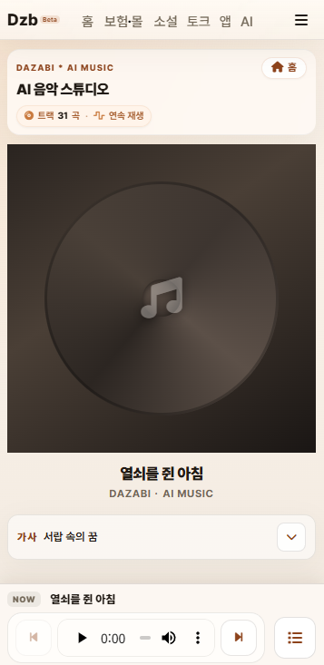 다자비를 통해서 AI음악의 맛을 느껴보시기 바랍니다.다자비 AI스튜디오로 오시면은 AI로 생성된 음악을 들을 수 있습니다.오픈베타기간에는 비회원,회원 모든분들이 들을 수 있도록 오픈합니다.여름에 오픈이 진행되면 비회원 모드가 약간의 제약이 있을 수 있습니다. 개인정보 없이 소셜로그인으로 간단히 가입 가능한 회원 가입 많이 부탁드립니다. 현재 오늘 추가 된곳…