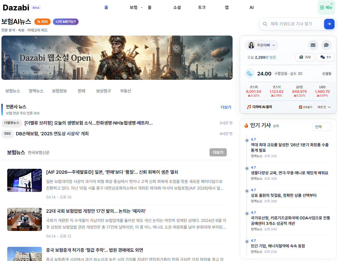 ◆ 26.3.26 수정사항 메인홈페이지에 폰트 크기 및 가독성을 위한 일부 UI디자인을 변경하였습니다.보험포털 포털 검색 활용도가 낮아서 조금 더 직관적인 포털 검색 UI로 변경하였습니다.모바일 휴대폰에서 상단 공간활용을 위해서 로고를 Dzb로 변경하였습니다. (약어변경)기존 속보 기사 체크 (현재 새로운 기사 수집 시스템을 새로 구축하고 있습니다. 완료시…
