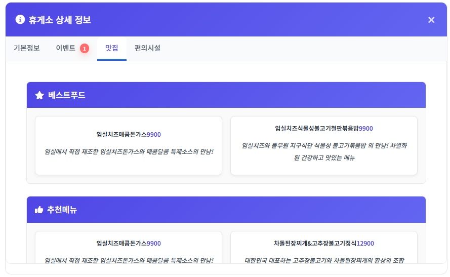- 주유시세를 한번에 조회가 가능하고 휴게소의 식당까지 조회가 가능합니다.