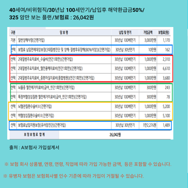 ※보험회사 상품별, 성별, 연령, 직업에 따라 가입 가능한 담보와 가입 금액, 보험료 등은 달라질 수 있습니다.